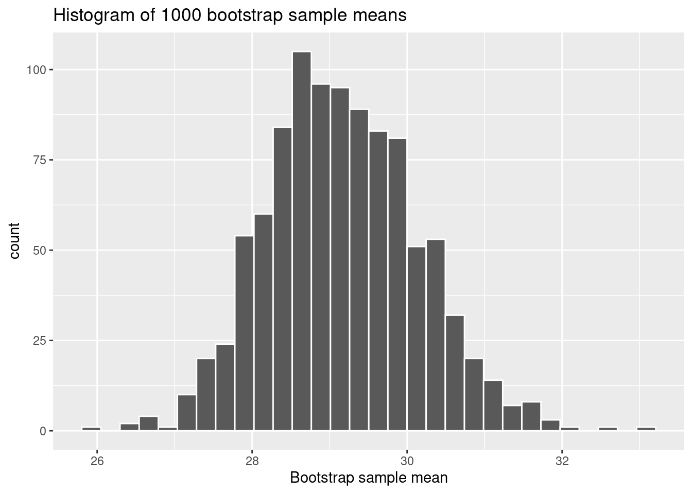 The generate() function resamples the original data with replacement to create 1000 new bootstrap samples, which are used to estimate the sampling distribution of the sample mean.